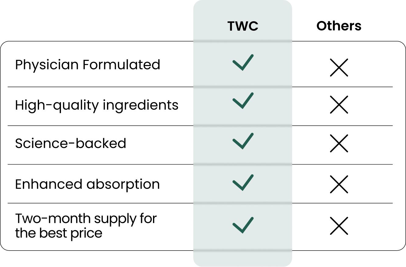 We carefully select every ingredient in our products and are committed to complete transparency about our formulas. With TWC, you can trust that you're receiving only the best for your body.